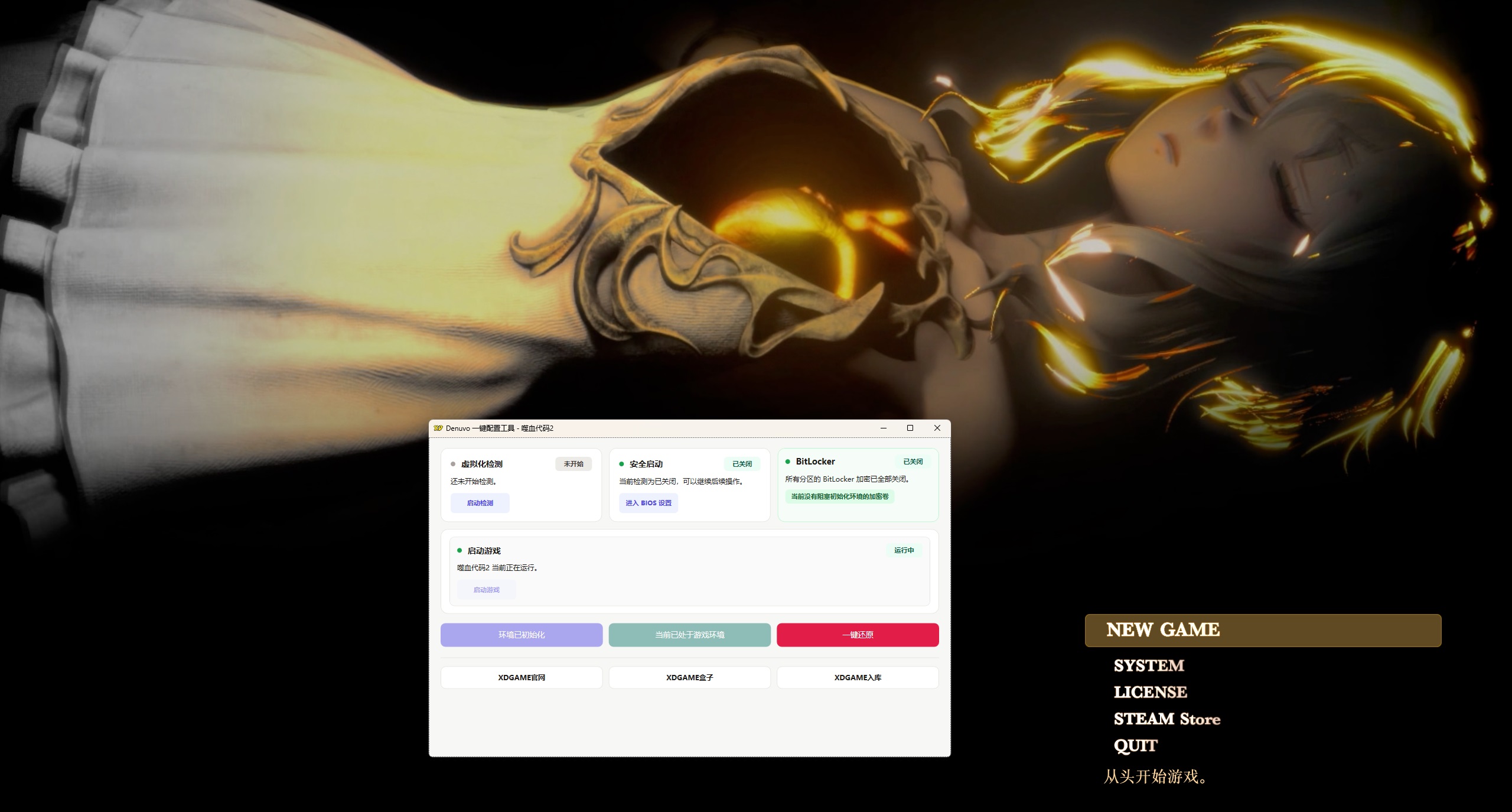 《噬血代码2》邀请你与搭档一同深入末日后幻想世界,迎战强大的吸血鬼,展开一场跨越时空的壮阔死战——交织而成的“戏剧性探索动作RPG”,等待你的到来。 虚拟工具现已进入成熟阶段(想体验的可以试试了)虚拟机只是用来绕D密,所以玩起来和正常版基本没差,几乎没有性能损耗。 没动手能力嫌麻烦不建议搞(其实也没想象那么麻烦),不过你真的能搞懂,D加密游戏有相关补丁全都是可以玩的。 Q1:会不会搞坏电脑 A:不保证所有人硬件都兼容都能玩,考虑清楚在下!部分人存在一定蓝屏/死机/损坏系统风险!玩不了就删不提供任何折腾帮助! Q2:游戏会不会很卡,容易闪退 A:虚拟机仅用来绕D密,几乎不占用性能。这些大作要求配置较高,有些优化也一般,(能玩情况下)如果闪退,你玩正版极大概率也会闪退 Q3:有些游戏个别CPU玩不了吗? A:最近更新的游戏补丁,大部分都能玩,之前游戏的补丁作者也一直不断更新迭代中,这是虚拟机正在迈向成熟阶段,但不保证所有人硬件都能玩考虑清楚在下。 打开游戏之前的环境准备(所有人都必须做 只需要做一次 后续畅玩所有D加密游戏) 进入主板bios设置 1. 开启虚拟化: 找到 SVM Mode (AMD) 或 Intel Virtualization Technology (Intel),设置为 Enabled。 2.关闭安全启动: 找到 Secure Boot,设置为 Disabled。 注:每个主板具体设置不同 不知道设置可以百度查询或问豆包自己主板型号的相关设置 以上都完成后:打开Denuvo.exe 检查第一排设置是否都已经完成 都显示小绿点代表以上步骤完成 都显示小绿点代表完成,我们点击软件的初始化,然后重启电脑【开机时点F7 或 手动选择禁用驱动程序强制签名】 重启电脑后继续打开Denuvo.exe点击 启动游戏 → 开始玩耍 ↓ 站长亲测截图 ↓ v1.0.6(Build.22261587)|容量62.6GB|官方简体中文|支持键盘.鼠标.手柄游戏介绍